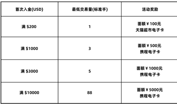 的”、“新客户”)可以在满足活动要求的最低首次入金和最低交易量后获得一次活动抽