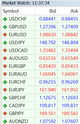 市场报价窗口现在将显示您选择的交易工具。要查看该工具的价格图表,只需将新添加的符号拖动到图表窗口即可。