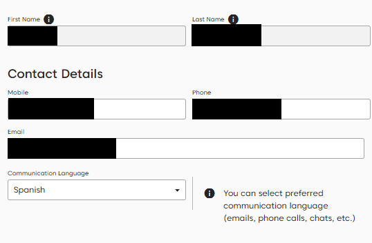 然后,您可以看到联系信息页面,进行更改/更新您的姓名、出生日期,电子邮件、居住地址,手机/电话号码和首选语言。