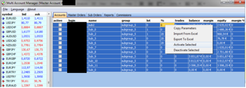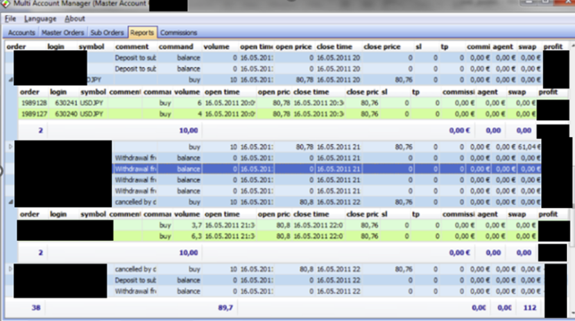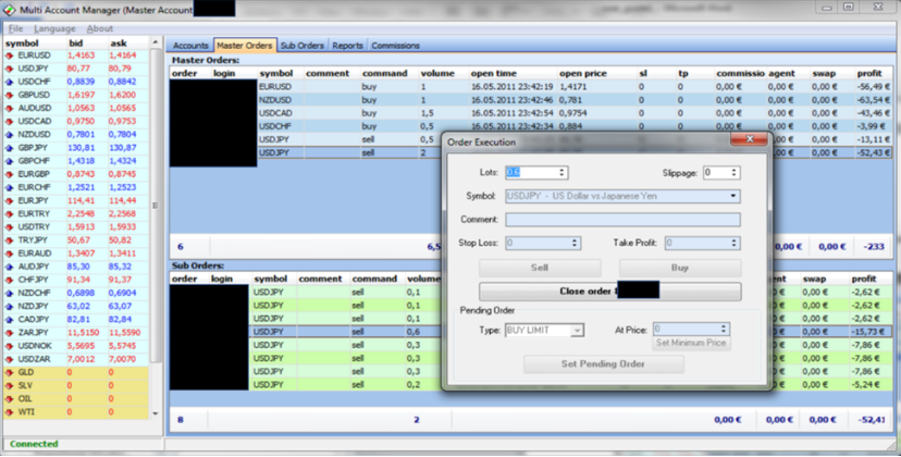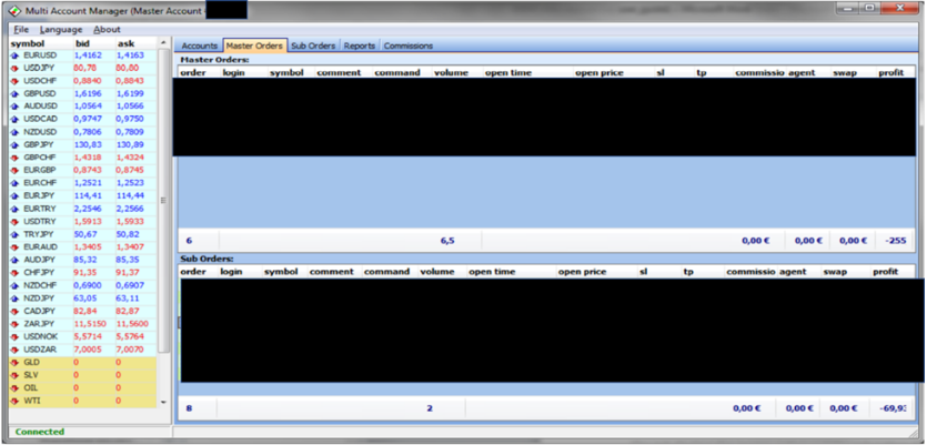 在MAM应用程序中初始化账户后,可以通过MT4客户端终端或MAM客户端应用程序在主账户上进行交易。此选项卡显示主订单和投资者(从属)订单。当选择一个主订单时,也会显示相应的投资者订单(子订单)列表。