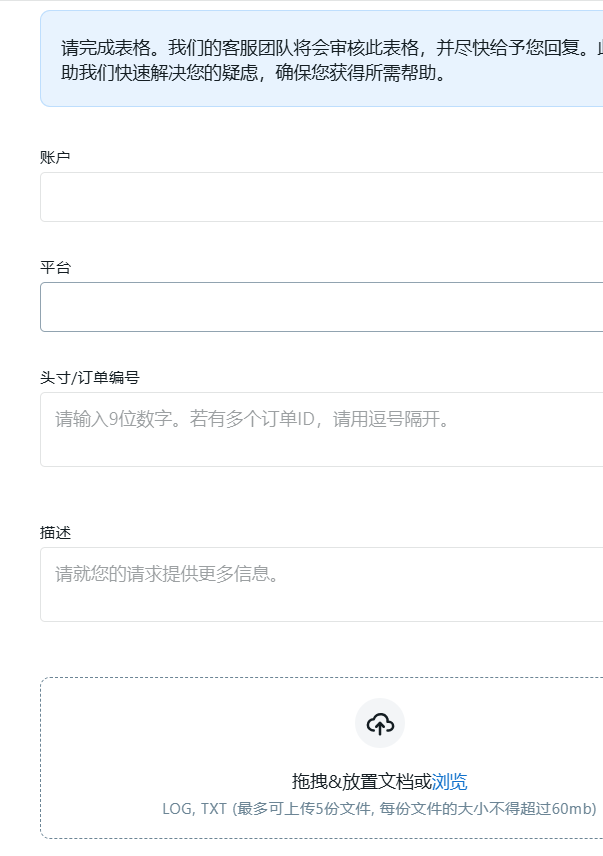 第七步填写对应的交易账号,MT5或MT4软件,交易订单号,在描述中说明一下交易的原因,如果有问题导致的亏损也可以将订单号对应亏损金额,及总共亏损多少写进去,申请补偿。最后将带有订单号交易品种亏损多少的完整截图提交进去,然后安排提交即可