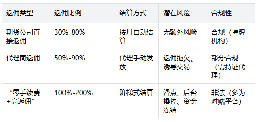 部分平台通过发展代理商拓展客户,代理商可获得其名下客户手续费的一定比例返佣,再将其中部分返还给客户。这种模式下返佣层级可能达2-3级,顶层代理商返佣比例可达90%以上,但底层投资者实际获得的返佣往往被层层克扣。更有甚者,代理商会以“高返佣”为诱饵,诱导客户高频交易以赚取更多佣金分成。