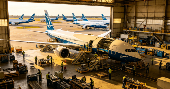 最让人惊讶的是他攒下来的待交付订单。这些都是已经跟客户签了合同,客户等着要,波音还没造完的活。这些订单加起来总价值有6950亿美元,直接创下了历史新高。说白了就是哪怕接下来波音啥新订单都不接,光把这些活干完,都够他忙上好几年。这也说明全世界的航空公司都抢着要他的飞机,市场需求特别旺盛。